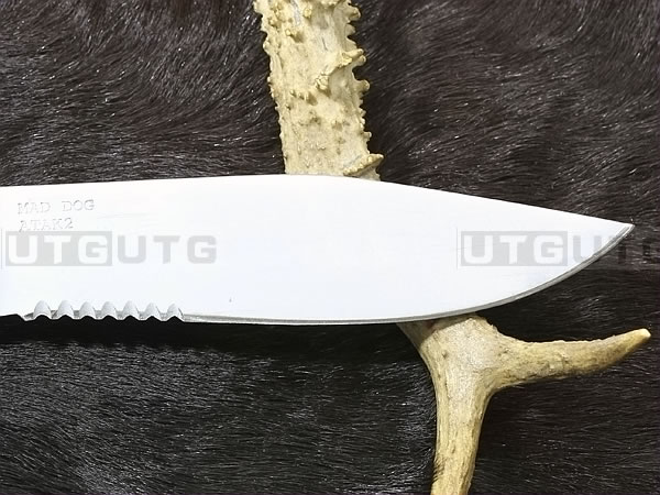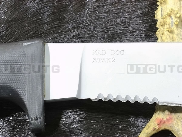 所有Mad Dog刃子及刃鞘系统都是以手工制作而成。Mad Dog钢材刃都是使用一种叫Starrett 496-O1的高碳工具钢,最独特的是它的热处理方式,先经过硬化(Hardened)然后再选择性回火(selectively tempered)而成。每个部分的热处理都不一样,刃锋部分的硬度是63-67HRC,在刃背部分则是50-55HRC,刃尖部分是59-61HRC,手柄部分48-52HRC,整刃分为4个部分处理,这种科学的方法成为分段热处理。这种方法可以使刃具既有很高的硬度又有较强的韧性,劈砍,穿刺,切割,撬砸等,能适应各种高强度工作。