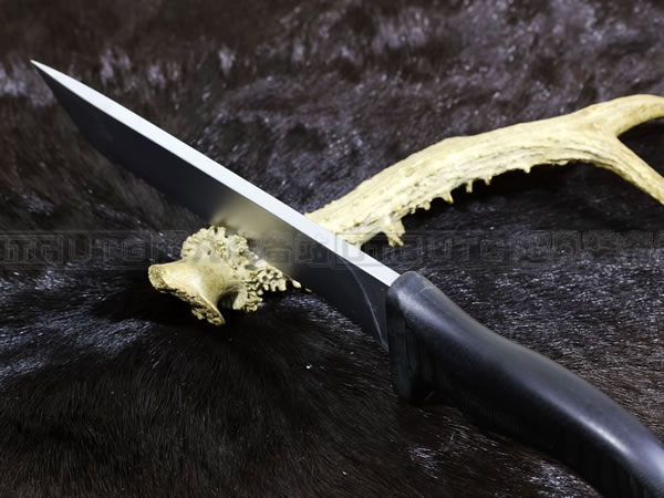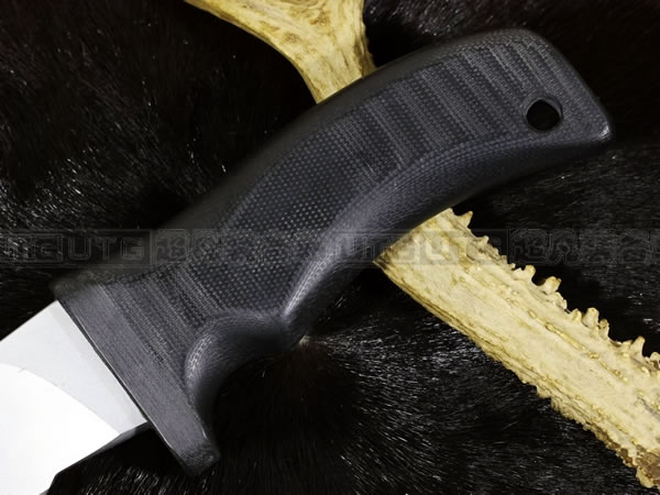 Mad Dog刃具的手柄都经过人体功能学设计,形状独特,把握极其舒适称手。它的食指凹槽让使用者即使看不见也能凭手感找到握刃的位置。手柄材料是一种不公开的黑色环氧玻璃,可承受极高压力和高温,这种材料可以轻易地承受 .45口径枪的冲击,而且几乎不被化学溶剂腐蚀。全隐藏式柄芯,确保使用者在工作时不会触电。