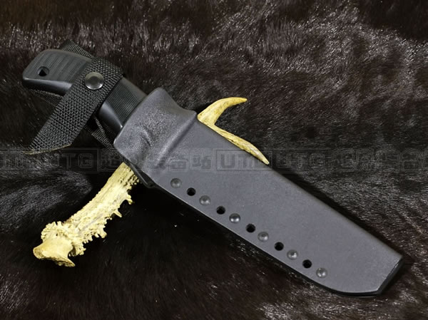 它的手柄符合人体工程学设计,把握极其舒适称手。食指凹槽让使用者即使看不见也能凭手感找到握刃的位置。材料使用特殊的玻璃纤维与环氧基树脂合成来做刃的握柄。此种特殊材质每一平方英寸可承受79000磅的压力(约3600公斤),可以轻易地承受0.45口径子弹的冲击。因此Mad Dog刃的握柄就算很严苛的使用也不会造成损害。此种握柄材质同时也提供了极好的绝缘,每0.001吋可承受1000伏特的电压,因而可以保护持刃者不会在使用刃具时遭受电击。另外这种握柄材质也几乎不受化学物质的渗透及侵蚀。