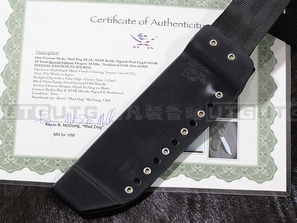 Mad Dog Knives ATAK ,全程应为Advanced Tactical Assault Knife-高级战术突击刃,这就是当年唯一在1992年通过West Coast SEALs残酷测试的测试刃。也是U.S. Navy Sole Source Justification测试排名第一的刃款。这些测试包括将刃插在两块木头间,然后由225磅重的人握住刃柄做“引体向上”,刃子仍然不会受到任何损伤。其它测试包括了切割砍剁各种材质,耐腐蚀测试及握柄防火测试等,实在是令人印象深刻。