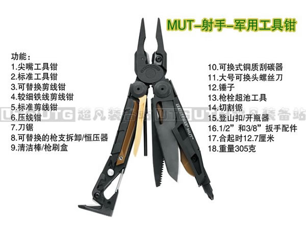 MUT是第一款可以用于军事、法治单位、或文职射手的战术和实用多功能工具。以多领域为特色的MUT包含了清洁棒和刷子,而且所有螺丝刃是按照正规军队及文职人员的瞄准调整工作需要的尺寸制造的。此工具还设计了可现场更換最常用零件的灵活性,只要一个简单的#8六角螺丝刃,让停用时间降至最低。有了这一切,加上MOLLE护套和范围调整扳手在內,MUT很可能是你工具包中最有效和实用的工具。