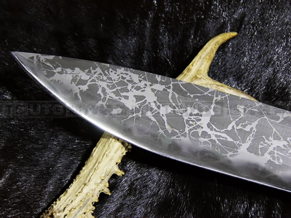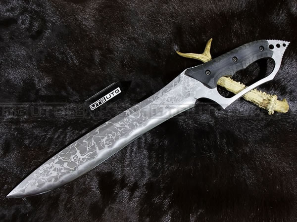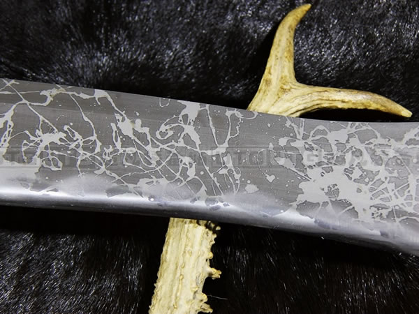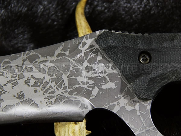 刃具全长55厘米,重量超过1.5公斤,劈砍起来威力巨大。手柄尾部的尾锥可以有效良好的完成凿击任务,并且有三个穿绳孔,使用伞绳可以防止暴力使用时刃具脱手。米卡塔手柄吸汗防滑,一体钢护手可以在搏击时有效保护手腕。刃身的表面处理依旧是松田菊男独特的酸洗技术,使得此款重型砍刃既实用又美观。