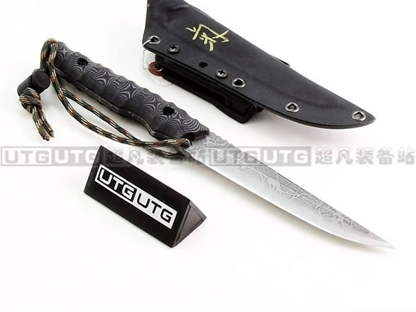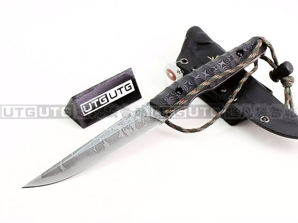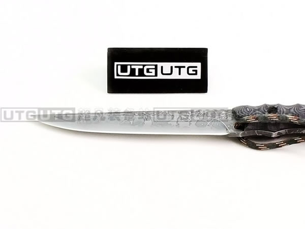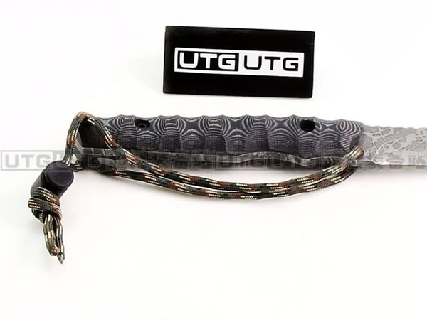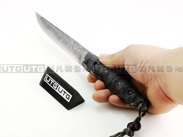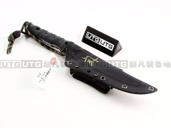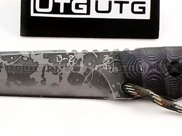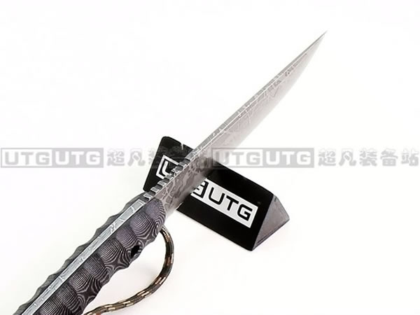 5英尺长的手波形外状手柄由黑色/灰色米卡塔材质分层制造完成,刃身背部设计有拇指切口(也称背齿),增加使用者持刃时的摩擦力,使得握刃更加牢靠。随刃还配备Kydex刃鞘和Tek-Lock腰带装置。