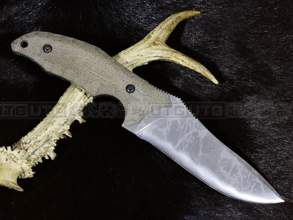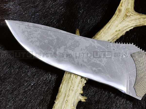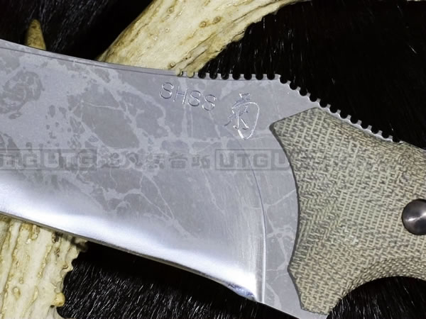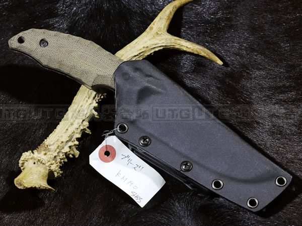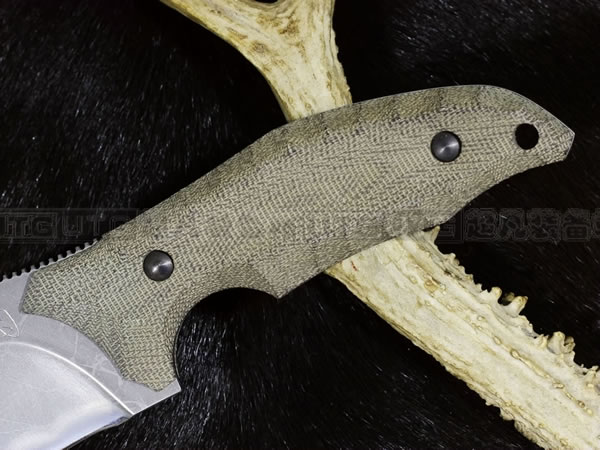 KM-190微风(BREEZE),是一把类似于村雨(Murasame)的4.75英寸实用型功能刃具,但是其由防锈型的SHSS超硬不锈钢制成。轻微内弯的凸磨刃身的背侧拥有较短的假刃,刃背处还拥有拇指凹槽,4.5英寸的OD绿帆布米卡塔手柄的末端拥有系绳孔。随刃佩赠拥有Tek-Lok腰带便携装置的手工定制Kydex刃鞘。