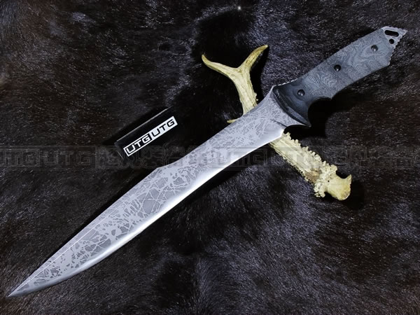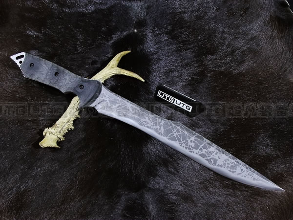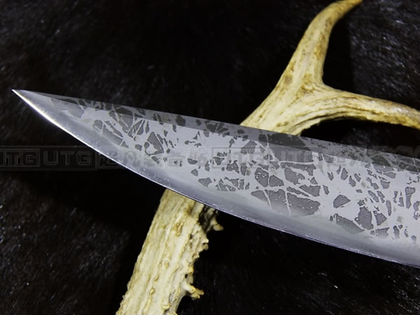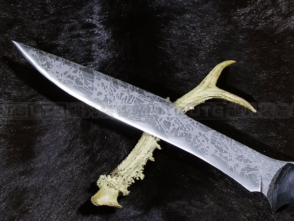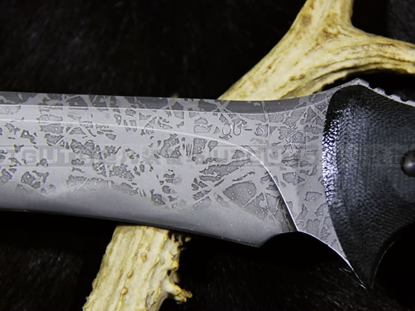 松田菊男"乌鸦"是一款长,与其他长款的长相比较为修长且刃面较窄。厚度却有0.85厘米厚,绝对是能够作为劈砍、削切的最佳利器、名副其实的。从刃刃上到刃背上的假刃口,都一再呈现他精湛技术。手柄采用橄榄绿米卡塔,底部可绑手绳。