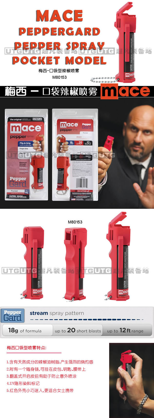 MACE的产品刺激成分多元化,效果显著。有多种组合配方,除了传统的CN、CS成分外,MACE主要刺激剂为可食用天然辣椒素OC,对人体只会产生暂时性瘫痪,成分安全但不会造成永久性毒副损伤。此外MACE还拥有多项专利,其压阀式系列喷雾具有安全保险盖,无渗漏、无堵塞、无误触。导向型喷头可定向精准喷射,其先进的指向性设计甚至在黑暗中也能精确命中目标。