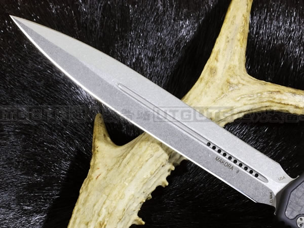 沿袭Ultratech的技术与概念,全新的 Makora "圣蚂蚁" 刃汇集众多功能于一身;虽然拉长的握柄在外型较长,但不仅铝合金握柄轻量化整体重量,更进一步运用碳纤维材质减低重量。 采用新型ELMAX不锈钢制造的刃身钢材表面经过石洗处理,握柄尾端附有玻璃击破器与可左右对调的背夹适用於任何用刃习惯;阶梯式的开关钮设计同时针对手戴手套时仍可灵活且扎实地使用。