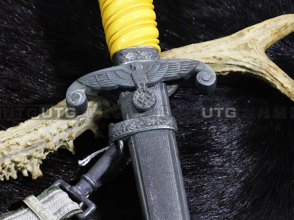 剑柄采用celulloid旋流设计 celullod(赛璐珞)是早期的塑料,非常结实和耐腐蚀,又能够防水,所以在当时的年代是一款科技含量相当高的原材料,颜色选用燃烧的黄色,上方是皇冠状的金属环,雕刻的图案是橡树叶偏向一侧,机匣是金属的设计,长翅膀的军鹰贴在最前面,喙部有一个直边,这种风格被称作是斧头的脸。