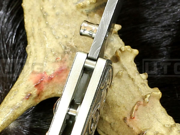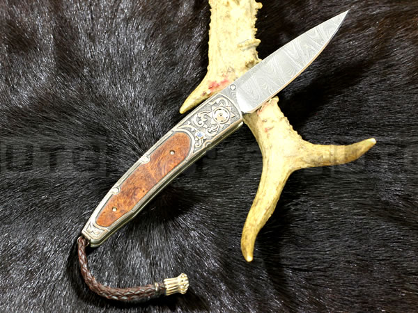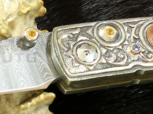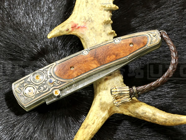 ⊙市面稀少带腰夹版 ⊙大马士革纹钢+上等木瘤 ⊙天然宝石开刃钮锁定钮