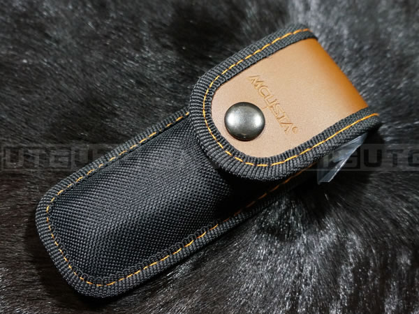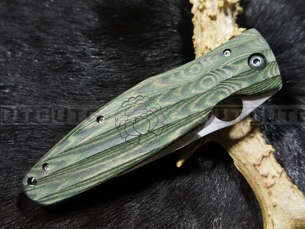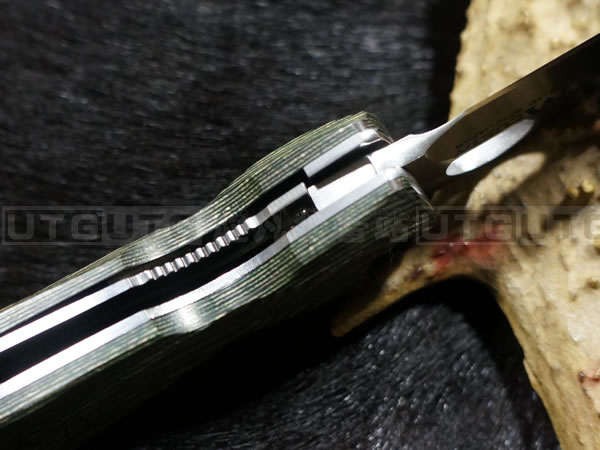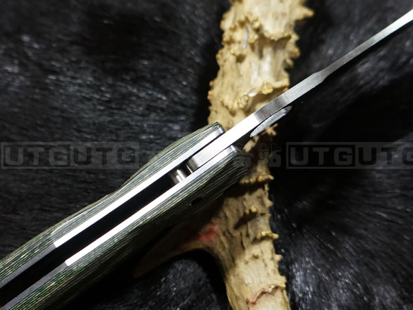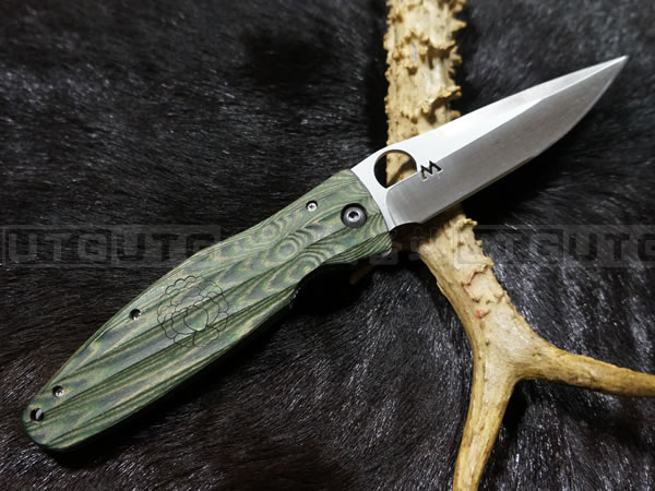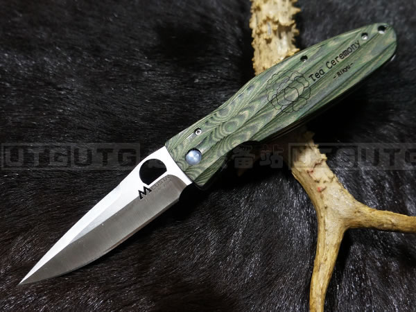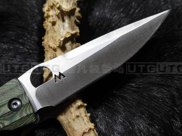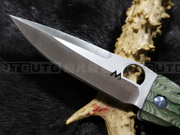 这款Rikyu 利休刃身采用VG-10钢锻造,经过平磨的刃身拥有极佳的锋利度,流畅的切割感受将给使用者一种别样的体验,锋利的刃尖和狭长假刃让刃具的穿刺力十足。刃身表面镂空刻有“M”标志,并采用推刃孔开刃机制。再配上独特的涂油特氟隆垫圈系统保证了刃具拥有流畅的开合动作。