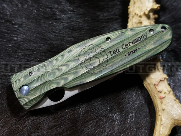 衬垫锁结构保障了刃具的安全性,经过抛光的不锈钢内衬外贴附有一层绿色米卡塔材质贴片,表面雕刻的凹凸纹路让使用者拥有更好的把握手感。柄身中部一侧刻有Tea Ceremony Rikyu字样,并在两侧刻有Rikyu家族茶道纹章。