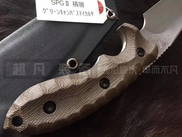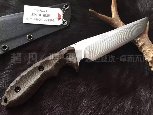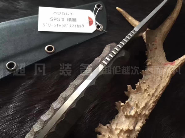 KM-710 Betsu-Kamui G 河神是松田菊田新作。在日语中Betsu-Kamui代表的是河神(God of River)。刃身使用日本武生特殊钢公司研制开发的改良型粉末高速不锈钢工具钢——SPG2锻造,Betsu Kamui 是由日本北海道专业猎人Chujyo先生设计的刀型。松田菊男使用SPG2钢材制作加以出色打磨,让刃具强壮而不失锋利性,尤其适合剥皮和劈砍动作,也可以出色的进行由下向上的刺入动作。